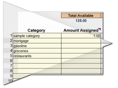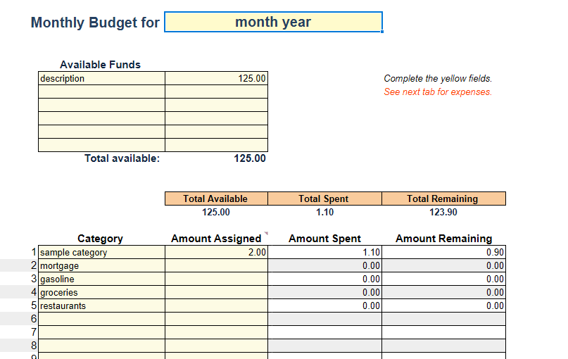 1. On the first tab, determine your monthly amount of money and assign some money to each category. Create your own categories.