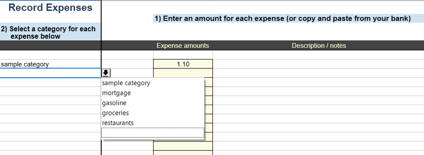 2. On the second tab, record expenses. You may want to copy and paste expense amounts from your bank's website or from your bank's CSV download.